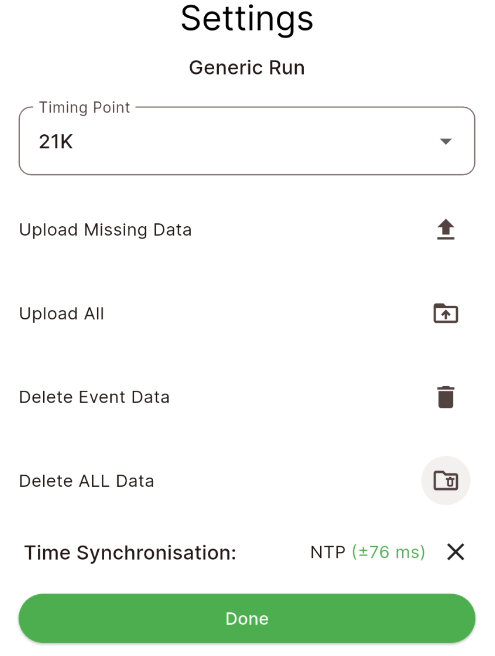 The settings dialog allows you to switch timing point during the event, it also manages the locally stored data on your device.