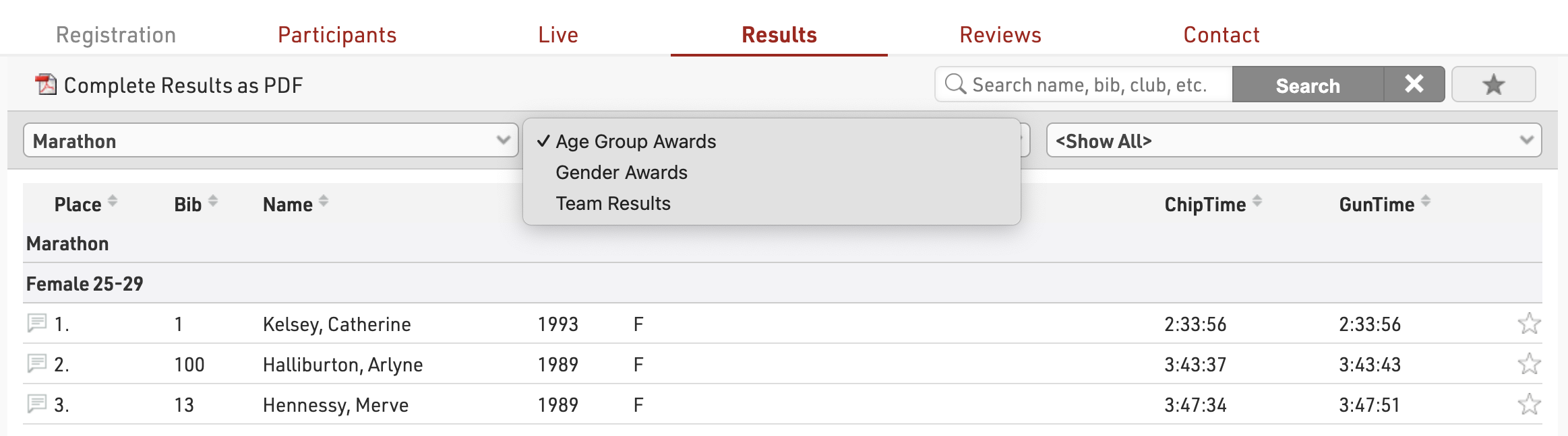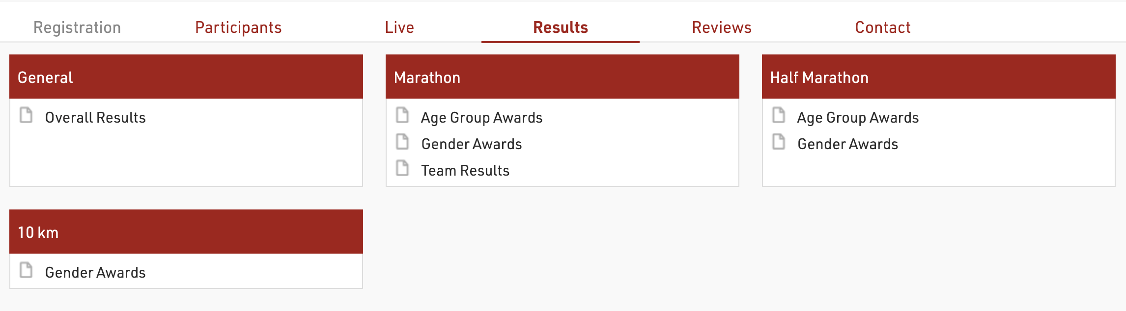 The Participants, Live and Results pages allow you to publish lists on my.raceresult.com, each page is intended to make it easier for viewers to find what they need.
