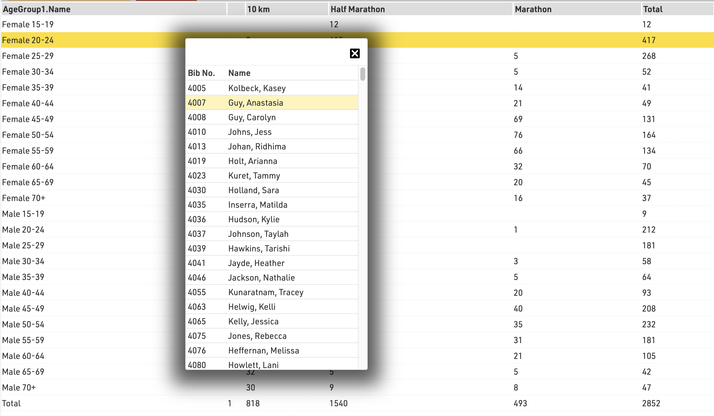 When viewing statistics, clicking on a value in the table will open a popup window with a breakdown of the participants considered in that item, clicking a participant will open that participants details in the right-side window.