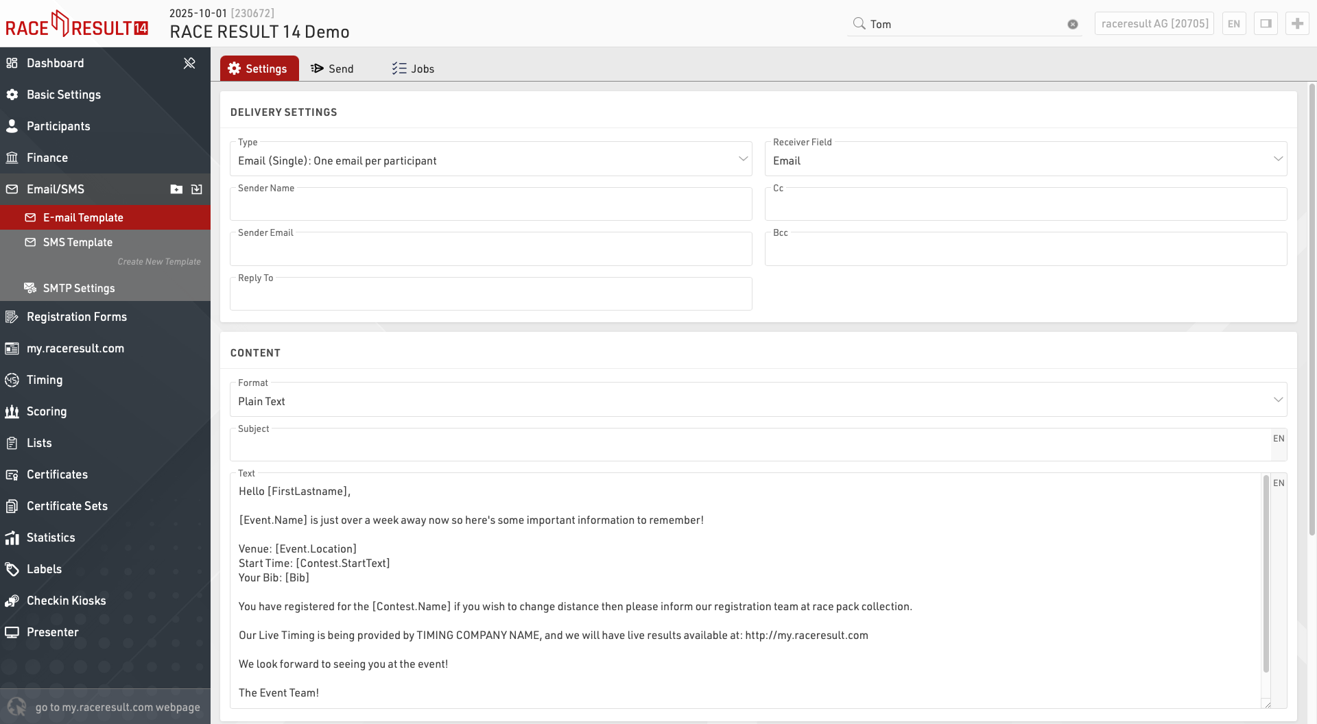 The Email / SMS Module allows for bulk sending of Emails or SMS to participants.