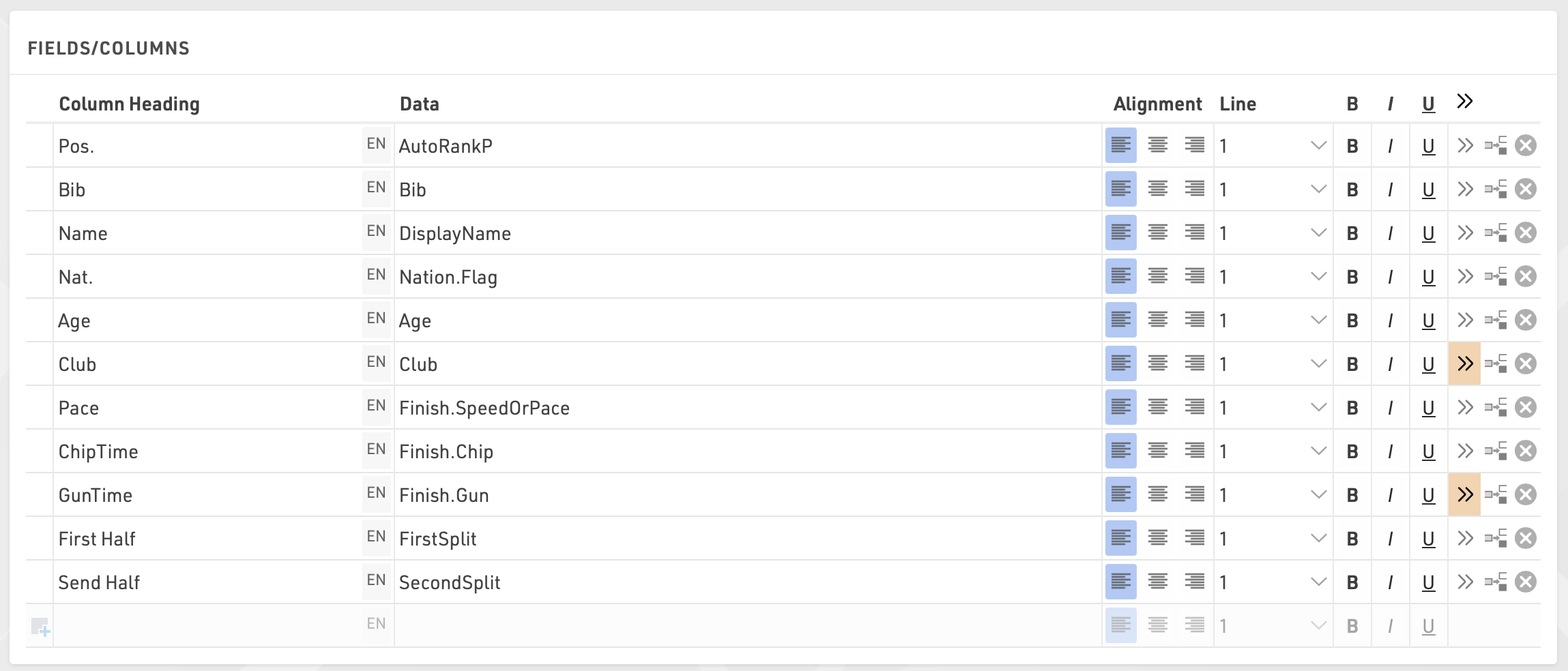 En este ejemplo cada split de la carrera se muestra en una nueva línea, para cada línea los campos de datos se muestran en el orden indicado. Los Encabezados de Fila son de 1 línea, usando texto simple con formato personalizado. Puede ser necesario añadir campos en blanco usando "" si necesita columnas para alinear correctamente.