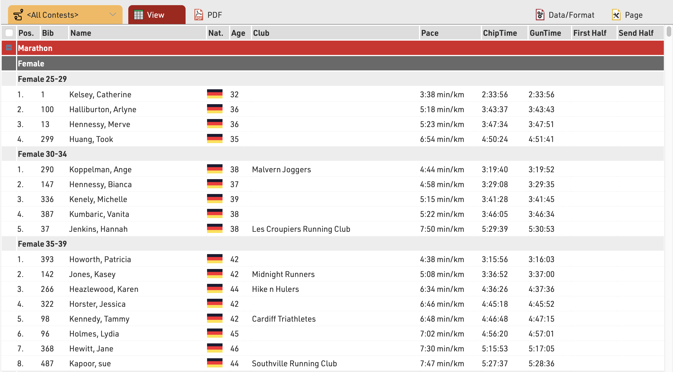 Fields can also be used as a Grouping or Filter, when used as a Grouping then a group header line will be inserted for each group value on all output types. Alternatively a list can be filtered by a group, with this setup an additional dropdown will appear in the preview and also on my.raceresult.com for each filter which can then show all groups, filter to a specific group, or ignore this level of grouping all together (if filter with ignore is selected). Filter is particularly useful for online results to make these easier to navigate / filter to the data somebody actually wants to view.