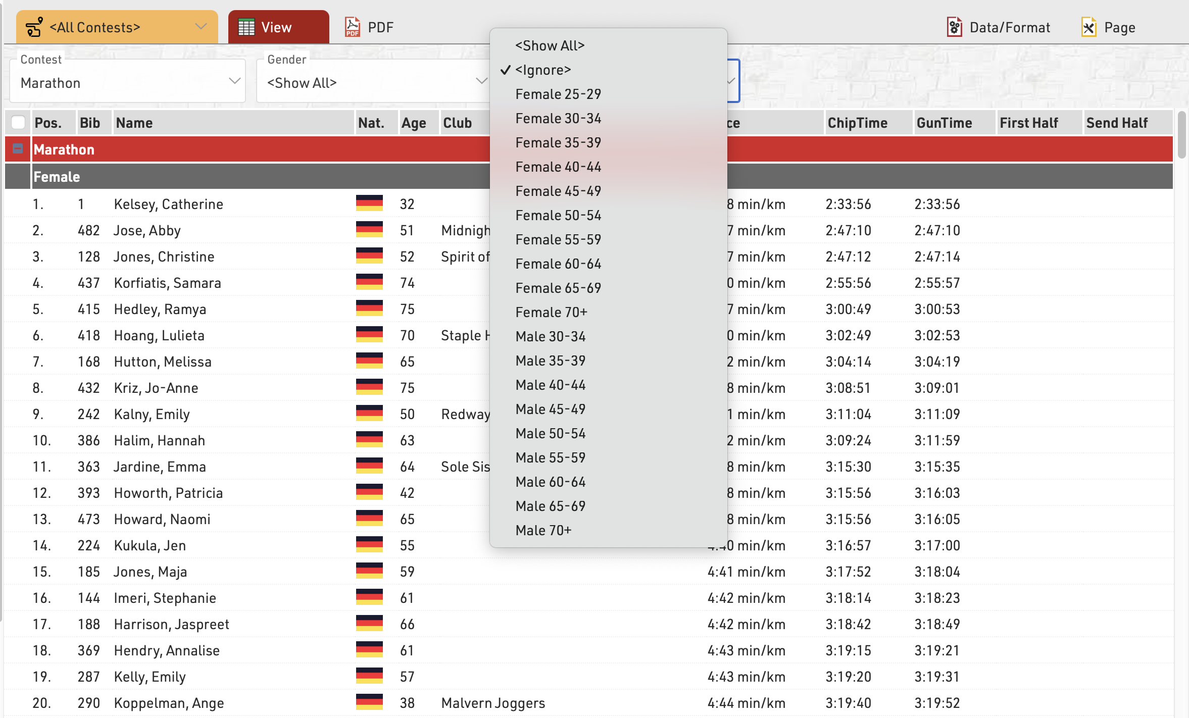 También se pueden aplicar filtros, los cuales permiten filtrar manualmente las listas, utilizando los selectores desplegables adicionales de acuerdo con los valores disponibles. Estos filtros también aparecerán en my.raceresult.com cuando se utilicen listas de salida en línea. Filtro con Ignorar le permite también ignorar cualquier agrupamiento, por ejemplo si filtra por género puede ser útil ignorar esto y mostrarlo todo junto. Tenga en cuenta que cuando se aplica un "Ignorar", también se ignorará cualquier filtro o agrupación que se encuentre debajo.