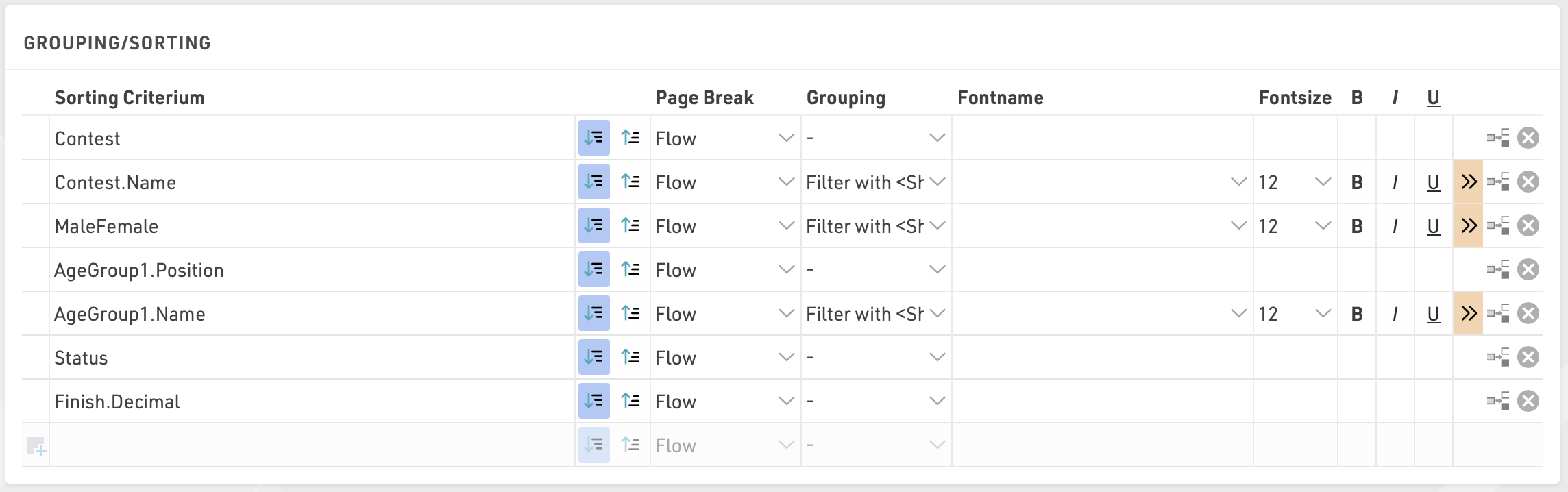 Con frecuencia, la lista se agrupará por un campo, pero no se ordenará por ese campo. Por ejemplo ordenar por ID de Competencia pero mostrar el Nombre de la Competencia. En ese caso, simplemente ingrese el criterio de orden antes del campo de agrupamiento. En el siguiente ejemplo, la lista está ordenada por el ID de la Competencia, pero el encabezado del grupo mostrará el Nombre de la Competencia. De manera similar, dentro de las competencias, la lista está ordenada por posición del grupo de edad, pero el encabezado del grupo muestra el nombre del grupo de edad: