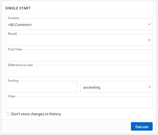 Con esta función estableces resultados especiales a intervalos fijos para los participantes de una determinada competición, por ejemplo para una salida escalonada de contrarreloj. Seleccione los Resultados en los que se guardarán las horas de inicio y defina la hora de inicio para el primer participante y los intervalos para las siguientes horas de inicio. El campo Clasificación define en qué orden los participantes recibirán las horas de inicio.