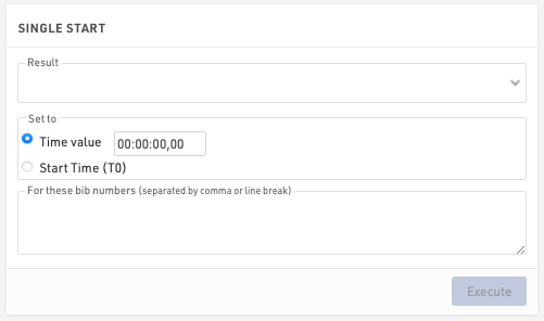 La segunda función le permite establecer un resultado en un tiempo fijo para un conjunto de participantes. Seleccione el resultado que guardará el tiempo, defina el tiempo e ingrese los números de dorsal que recibirán el tiempo de inicio.