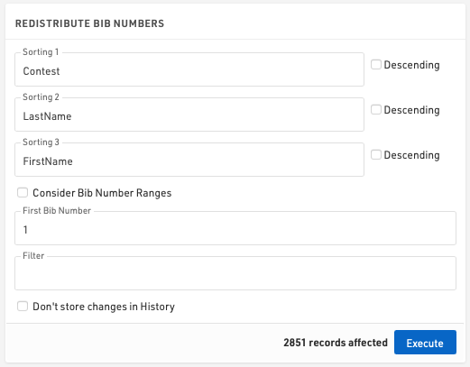 For this purpose you can select up to three fields which define in which order the new bib numbers will be assigned. If you activate Consider Bib Number Ranges, only numbers from the bib ranges of the chosen contest will be assigned.