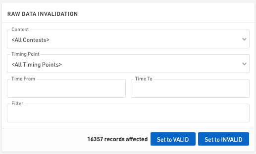 Using the Raw Data invalidation you can quickly select Raw Data for certain contests, timing points, time ranges and apply any filter. This will set all the Raw Data which fits the criteria to invalid and so will not be used in Results calculations.