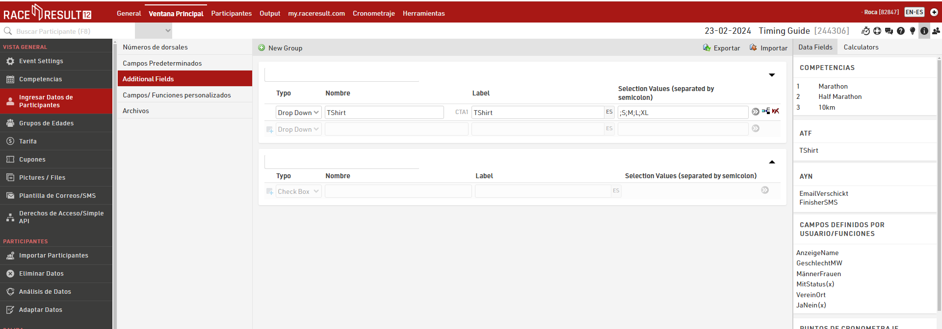 RACE RESULT 12 ya contiene algunos campos predeterminados básicos para almacenar datos de los participantes; si desea almacenar campos de datos de participantes adicionales, es posible que deba crear algunos campos adicionales para esto.