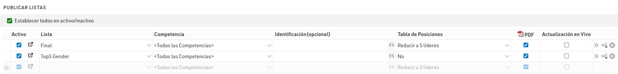 Con la actualización en vivo habilitada, las listas se actualizarán automáticamente en tiempo real, lo cual es muy útil para clasificaciones en vivo (live leaderboards).