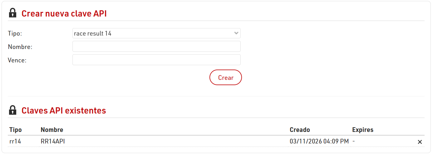 Las claves API se utilizan para que los desarrolladores o plataformas de terceros accedan a los servicios de RACE RESULT. Para obtener más información, consulte Claves API.