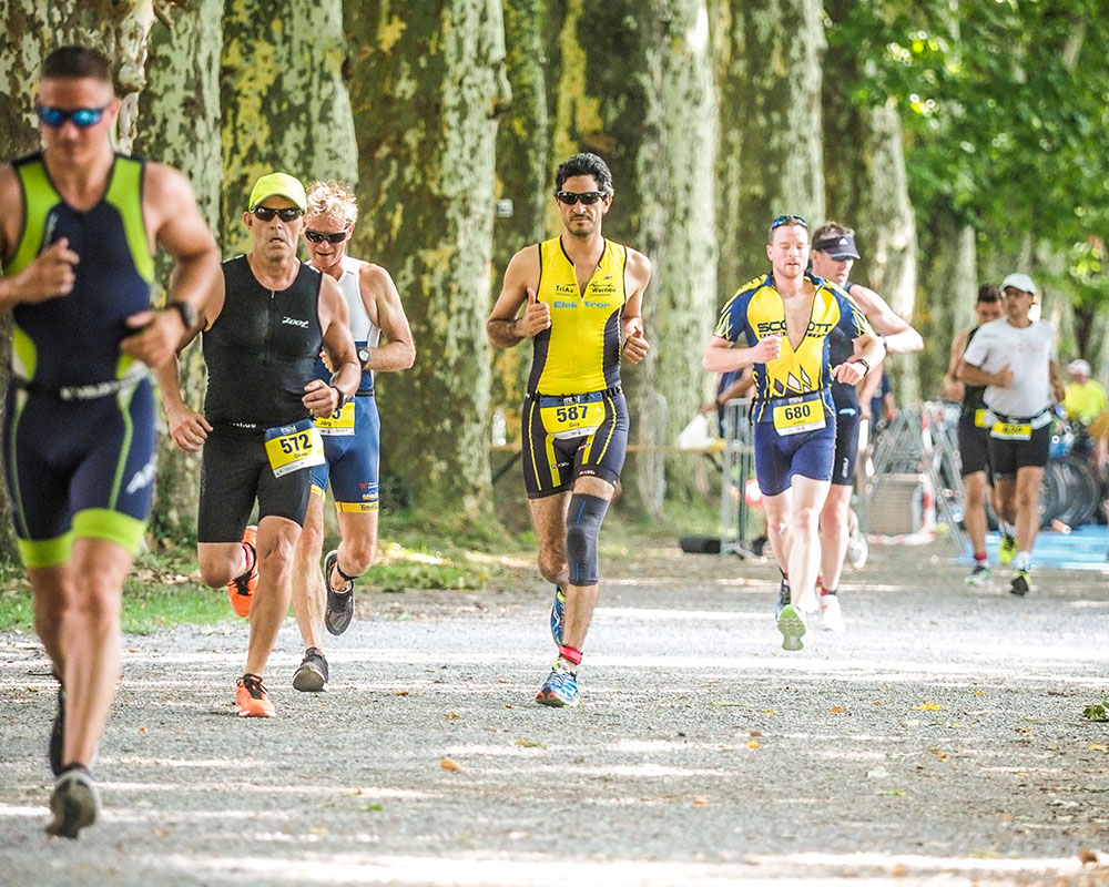 La puce triathlon est portée à la cheville – au-dessus de la combinaison ! Dans cet exemple, tous les concurrents partent de la plage. Le système de départ sert à identifier qui est dans l’eau.