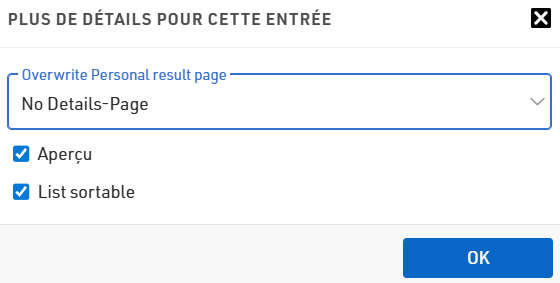 Si vous souhaitez afficher la page de détails uniquement sur certaines listes, vous pouvez utiliser Écraser la page de résultats personnels (Overwrite Personal result page) pour activer ou désactiver les pages de résultats personnels pour cette liste spécifique.