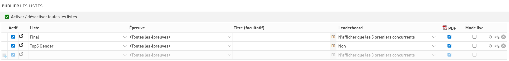Avec la mise à jour en direct (Live update) activée, les listes seront automatiquement mises à jour en temps réel, ce qui est particulièrement utile pour les classements en direct. Notez que cela ne sera actif que pendant la période de l'événement définie dans les Paramètres de base.