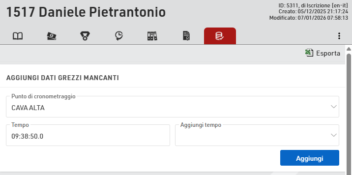 Inoltre, i tempi possono essere aggiunti manualmente nella scheda Dati grezzi della visualizzazione Partecipante. Per fare ciò, seleziona il punto di cronometraggio corretto e quindi inserisci l'ora corretta da aggiungere ai dati grezzi dei partecipanti con "(Manuale)" elencato come dispositivo.