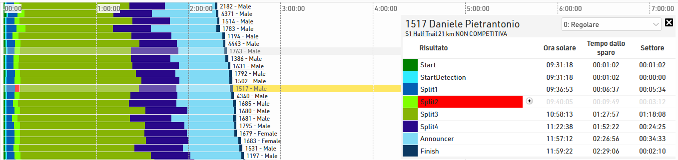 Il grafico mostra una barra per ciascun partecipante con almeno un tempo negli intermedi o nei risultati speciali selezionati. Una barra rossa indica che manca un tempo e deve essere controllato.