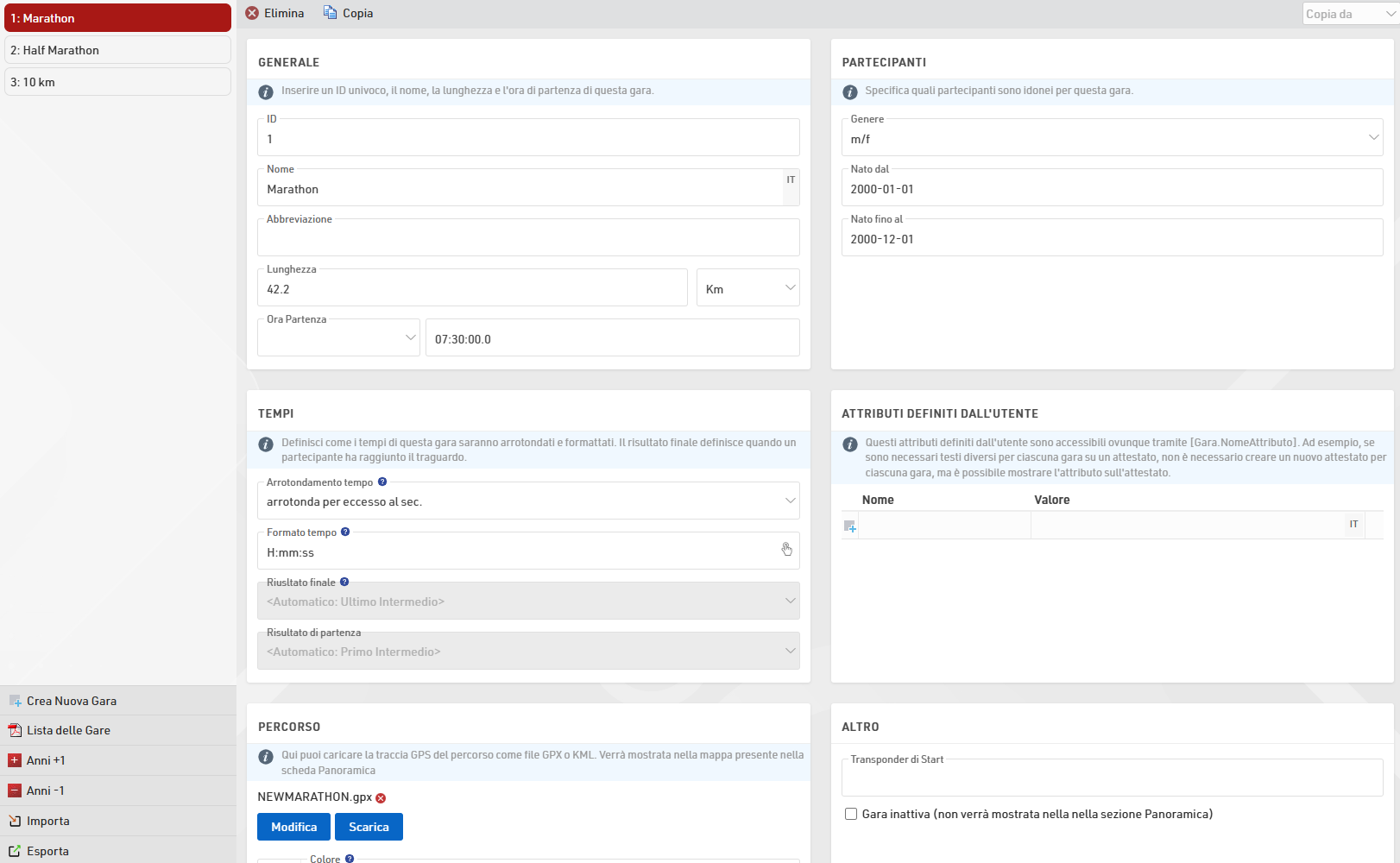 Inseririsci semplicemente il nome, la distanza / lunghezza e l'ora di inizio della gara e assegnale un numero univoco (ID).