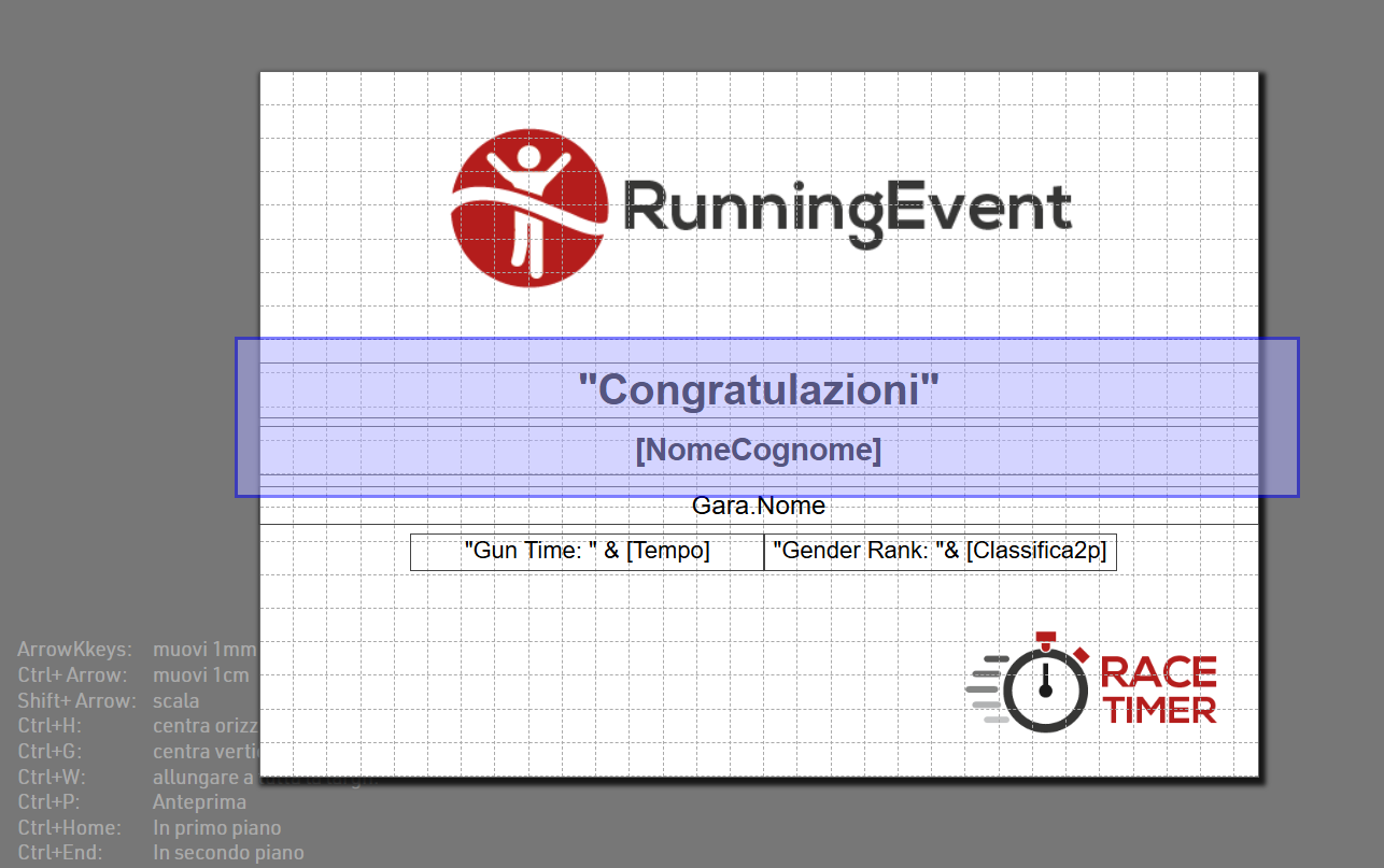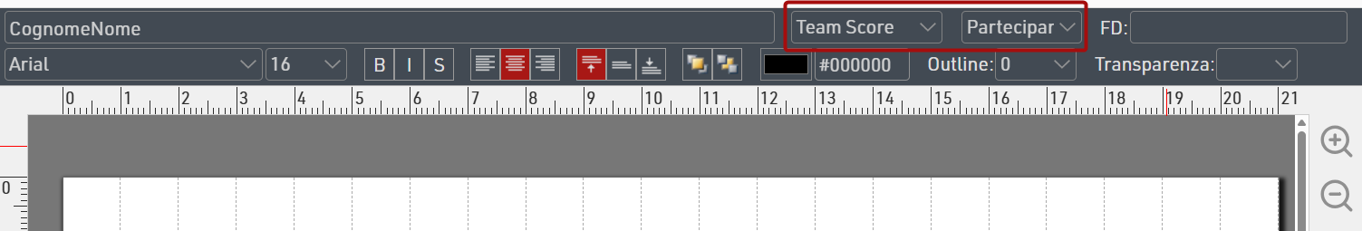 Per esempio se vuoi mostrare il cognome e nome del secondo membro della squadra (in accordo al Team Score 1), il sistema userà il campo TS1.P2.CognomeNome. Nell'anteprima puoi avere un risultato diretto di quello che stai facendo nell'attestato ma internamente verrà comunque usato il campo predefinito.