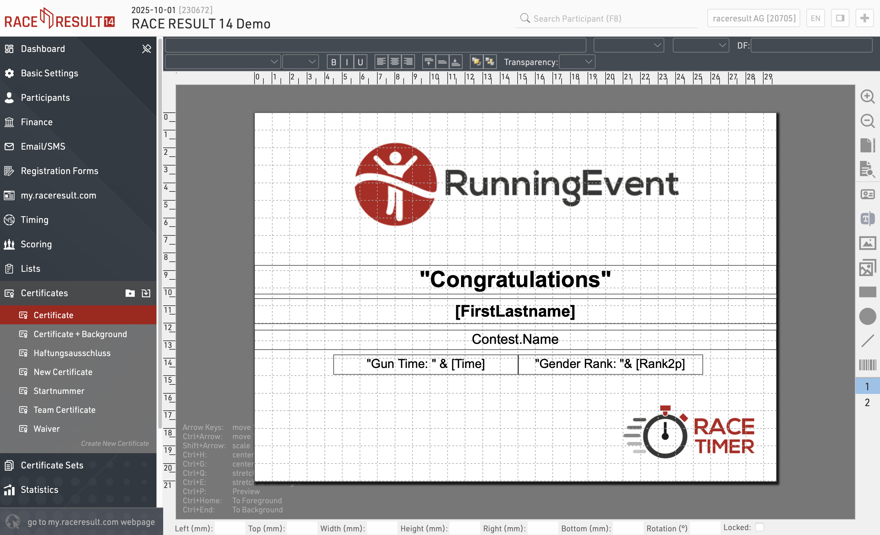 After adding an element to the certificate you can position and scale it on the certificate with the mouse. Alternatively, you can use the cursor keys (see keyboard codes in the bottom left corner) or use the entry fields at the bottom of the screen to position and scale the element.