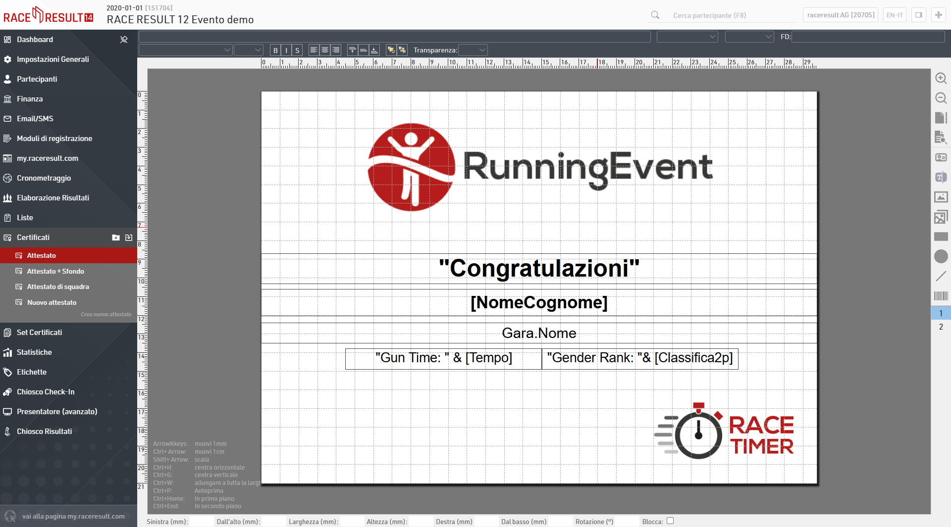L’elenco a sinistra mostra tutti i certificati presenti nel file dell’evento, che possono essere riordinati tramite drag & drop cliccando nello spazio libero a sinistra del nome nell’elenco.