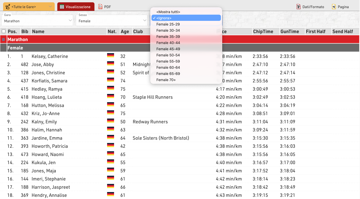 In alternativa, una lista può essere filtrata per un gruppo: in questo caso, un menu a discesa aggiuntivo apparirà nell’anteprima e anche su my.raceresult.com per ogni filtro, permettendo così di mostrare tutti i gruppi, filtrare per uno specifico gruppo o ignorare completamente questo livello di raggruppamento (se si sceglie “ignora” come filtro). Il Filtro è particolarmente utile per i risultati online, in modo da renderli più facili da navigare e permettere a ciascun utente di visualizzare solo i dati che gli interessano.