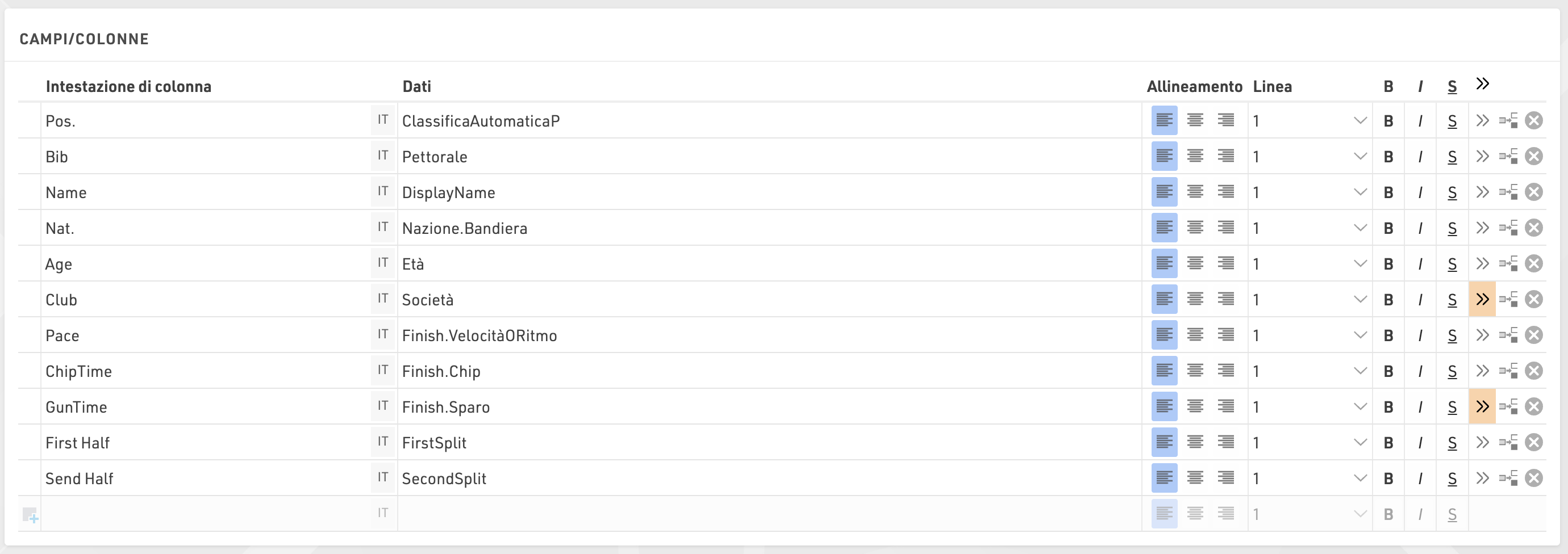 In questo esempio ogni intermedio della gara viene mostrato su una nuova riga; per ogni riga i campi di dati sono ancora mostrati nell'ordine elencato. Le intestazioni di riga hanno Linea 1, utilizzando un testo semplice con formattazione personalizzata. Potrebbe essere necessario aggiungere campi vuoti utilizzando "" se è necessario allineare correttamente le colonne.