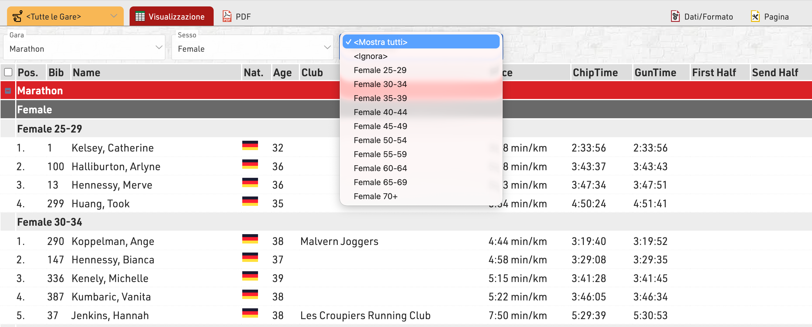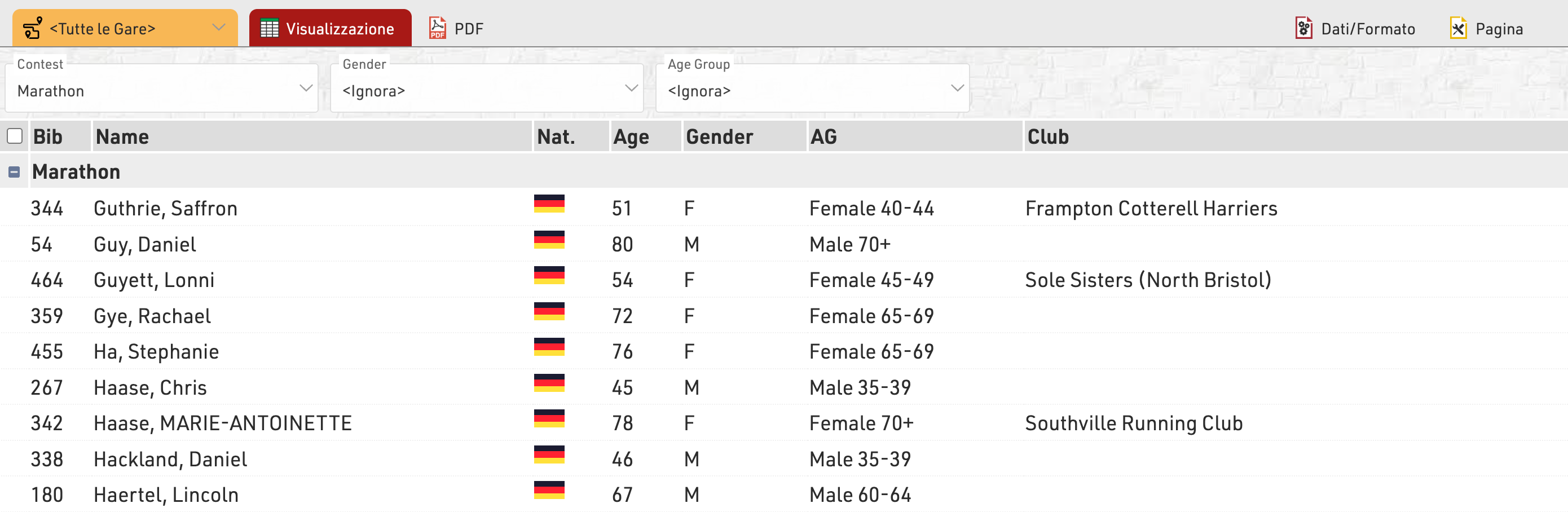 Questa lista è raggruppata per gara, genere e fascia d’età: