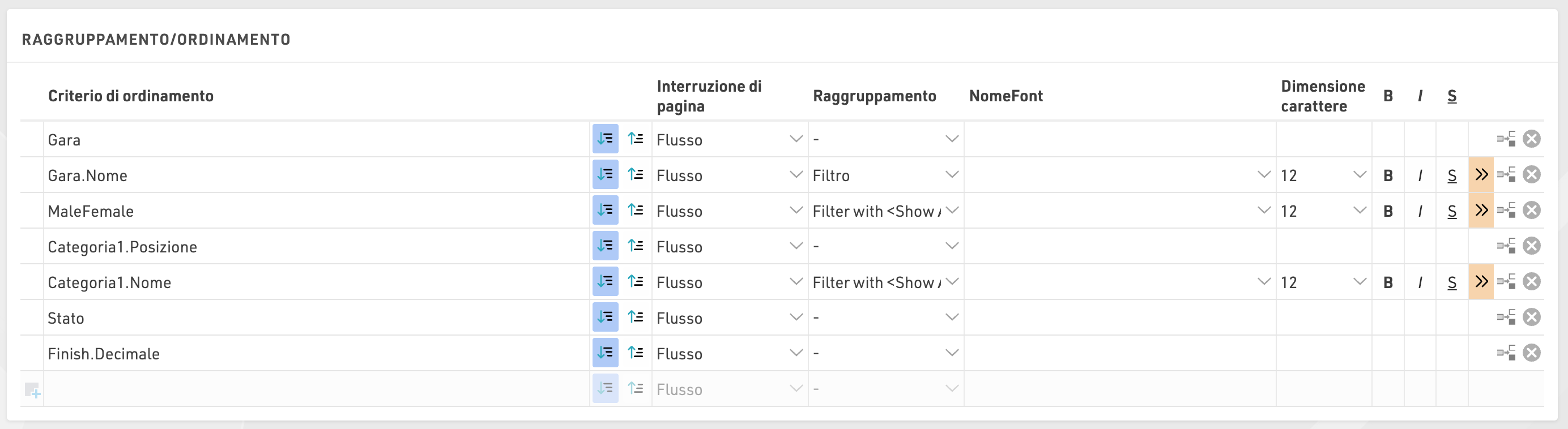 Se usati come Raggruppamento, verrà inserita una riga di intestazione per ogni valore del gruppo in tutti i tipi di output.
