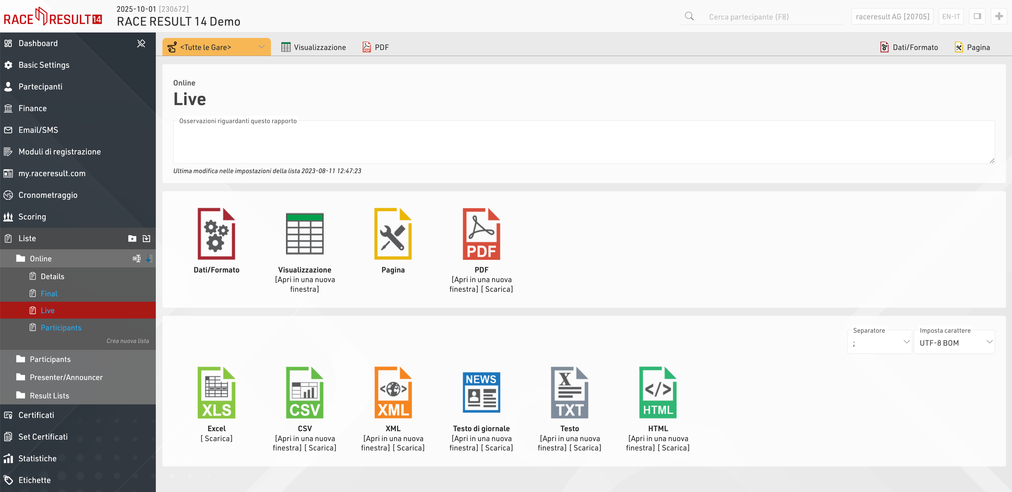 Le liste sono il metodo più importante per estrarre dati da RACE RESULT 14 e vengono utilizzate per una grande varietà di applicazioni: risultati stampati, pubblicazione dei risultati online, schermi per i presentatori, creazione di liste statistiche personalizzate, checklist per la verifica dei risultati o qualsiasi report personalizzato di cui hai bisogno.