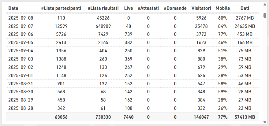 La sezione statistiche my.raceresult.com mostra statistiche giornaliere, quanti partecipanti si sono registrati attraverso la registrazione online e quanti elenchi e certificati di gara sono stati caricati. Dopo la data dell'evento, le statistiche possono essere raggruppate per mese, quando i dati sono meno rilevanti.