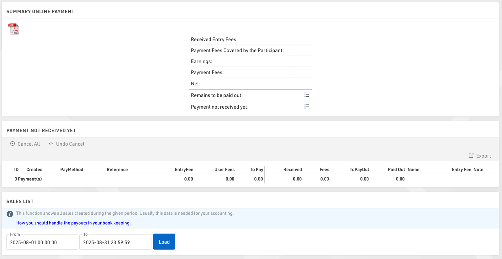 The Sales List allows you to generate a list of payments received in a specific time frame, usually required for accounting purposes.