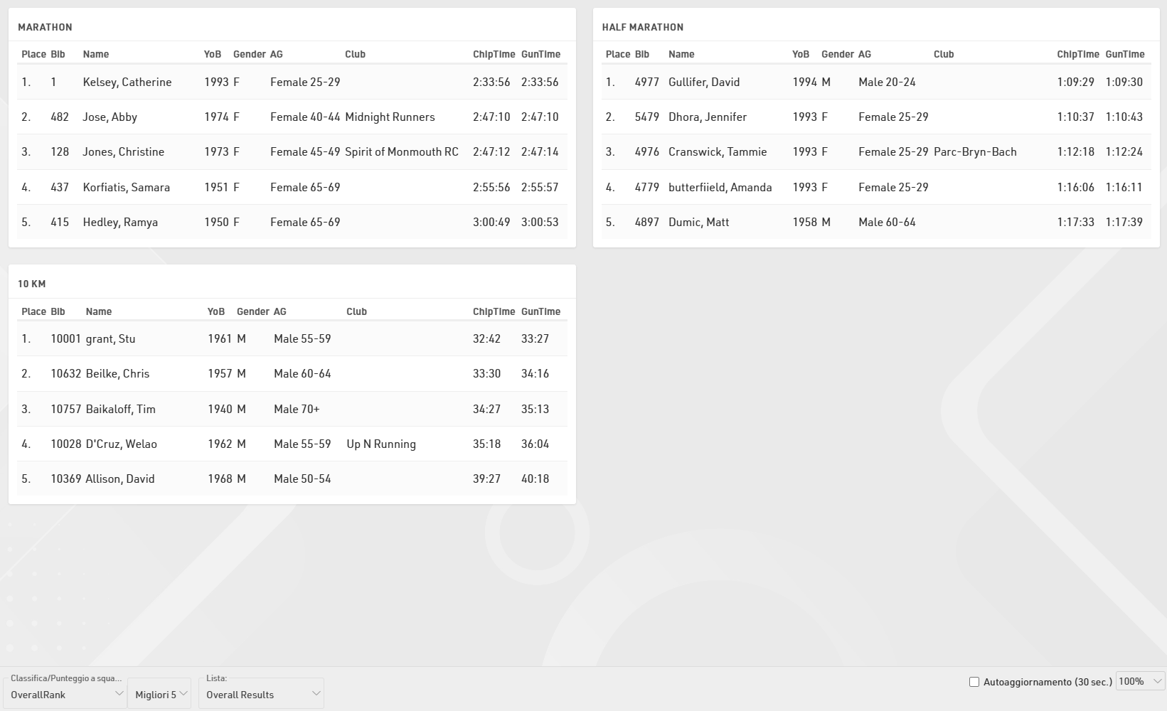 La Classifica mostra i vincitori o i primi in classifica (se la gara é ancora in corso) dell'evento. Attraverso le impostazioni presenti in basso, puoi selezionare il tipo di Classifica e il numero dei primi x partecipanti in ogni gruppo che vuoi vedere.