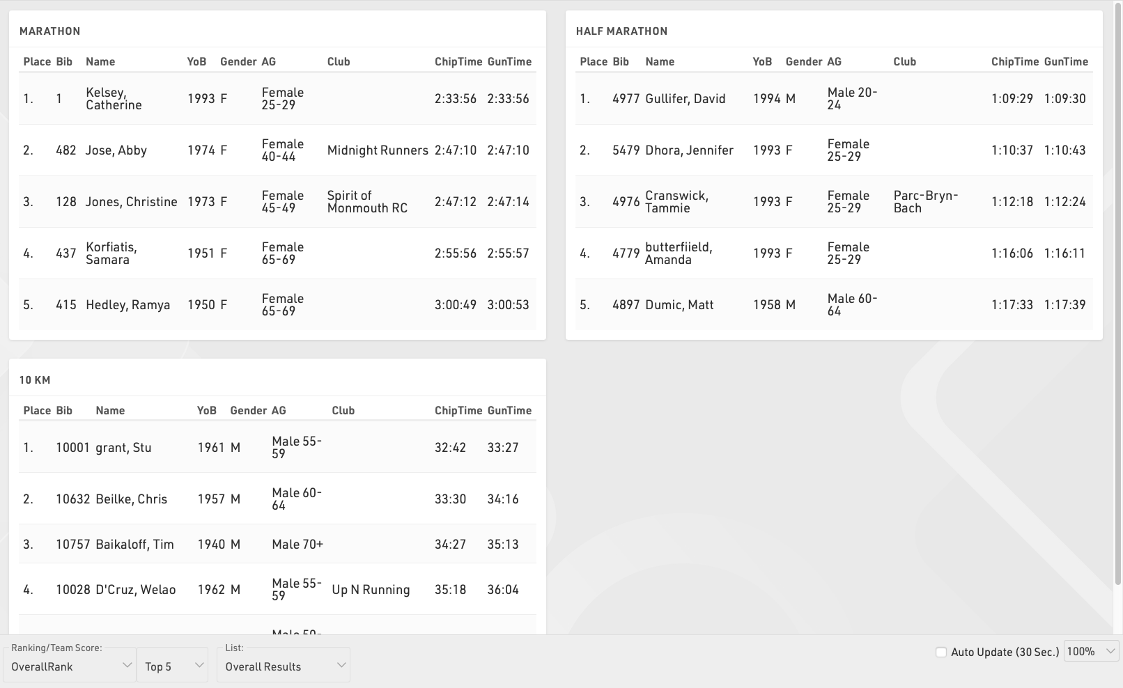 The Leaderboard shows the winners or current leaders of the event. Through the settings at the bottom of the screen, you can select a Ranking and a number x so that the first x participants in each group of the ranking will be shown.