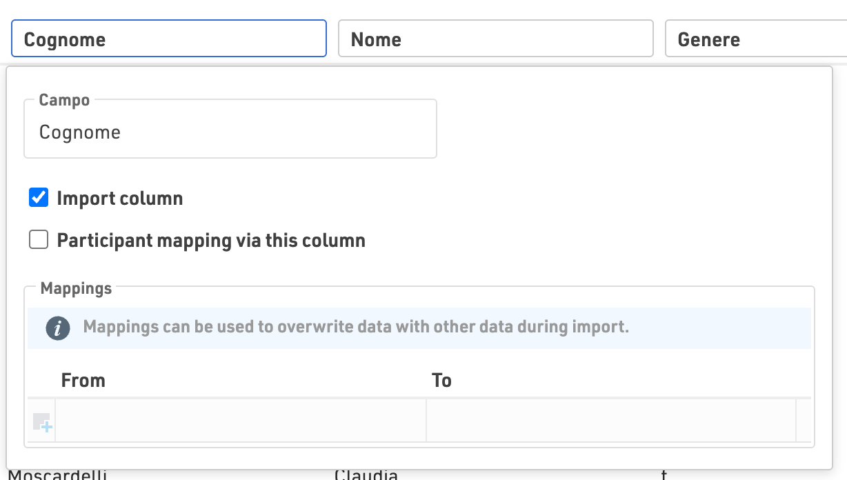 - Importa come nuovo campo: lasciare vuota la mappatura per creare un nuovo campo aggiuntivo che comparirà nei dati del partecipante.