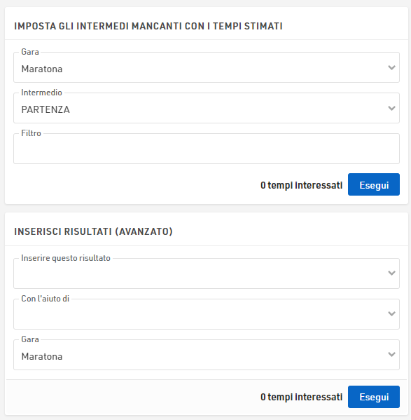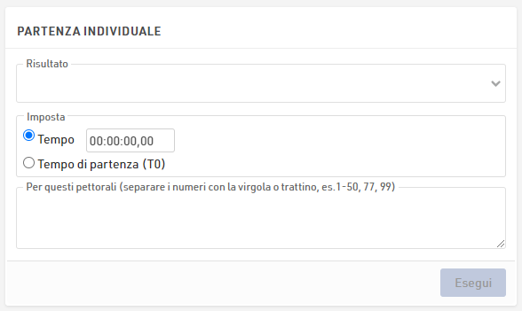 La seconda funzione consente di assegnare un certo tempo (di inizio) a un gruppo di partecipanti. Seleziona il risultato che deve salvare il tempo, definisci il tempo ed inserisci i numeri di pettorale che devono ricevere quell'ora di partenza.