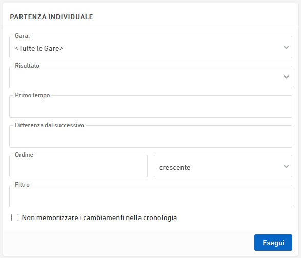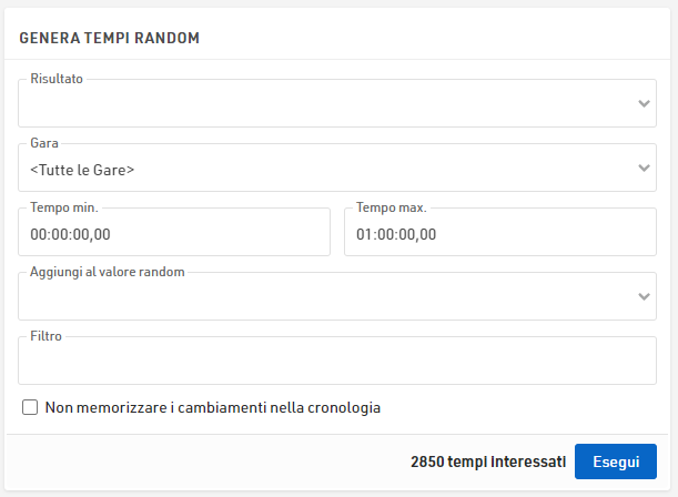 Con questa funzione imposti risultati speciali ad intervalli fissi ai partecipanti ad una determinata gara, ad esempio per una partenza scaglionata della Cronometro. Selezionare il Risultato in cui salvare gli orari di inizio e definire l'orario di inizio per il primo partecipante e la differenza dal successivo. Il campo Ordine definisce in quale ordine i partecipanti riceveranno gli orari di inizio.
