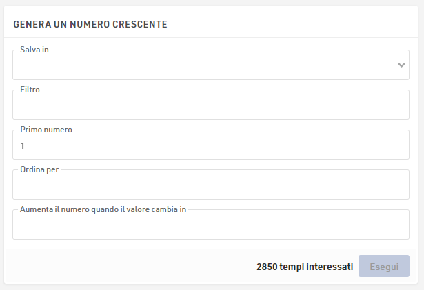 Questa funzione può essere utilizzata per creare un numero crescente che verrà poi salvato in un Campo Aggiuntivo.