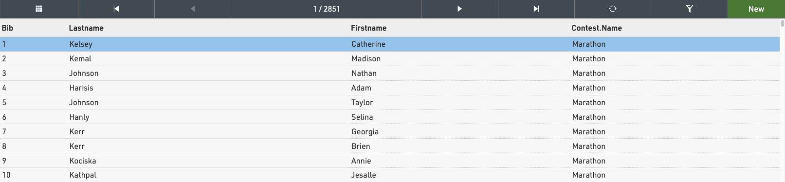 Clicking on a participant record from this table will open the Participant View for that participant to the right side of the table. The arrows in the top bar can be used to scroll through the participants one by one according to the current sorting of the main table view. Clicking New will immediately create a new blank participant record which will be opened in the participant view.