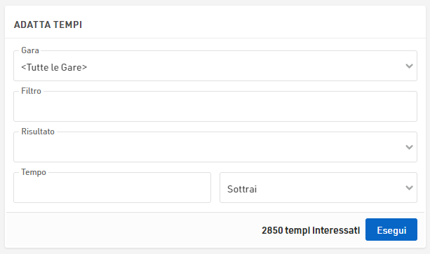 Con questa funzione puoi regolare i tempi (nei Risultati speciali statici) di tutti i partecipanti a un concorso aggiungendo o sottraendo un determinato valore temporale. Ciò non ha alcun impatto sui dati temporali grezzi.