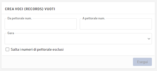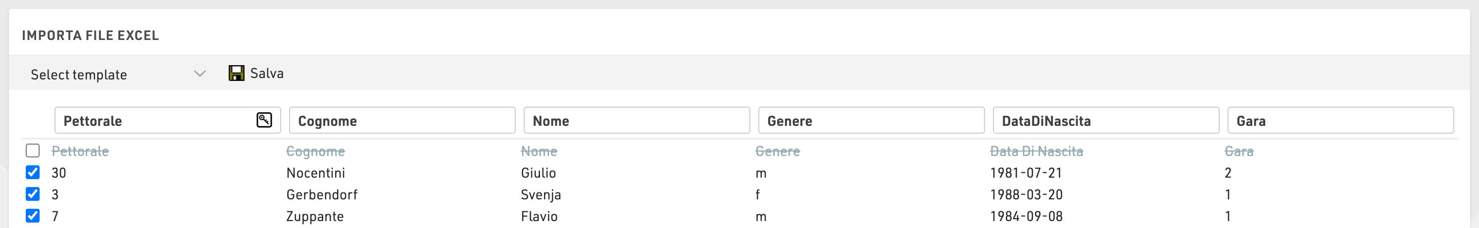 Può essere applicato un filtro all'importazione, ad esempio, potresti voler importare solo record per pettorali tra 1 e 500.