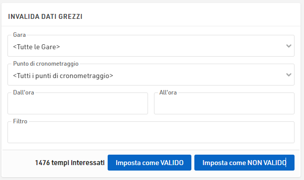 Utilizzando l'invalidazione dei dati grezzi è possibile selezionare rapidamente Dati Grezzi per determinate gare, punti di cronometraggio, intervalli di tempo e applicare qualsiasi filtro. Ciò imposterà tutti i dati grezzi che si adattano ai criteri su non validi e quindi non verranno utilizzati nei calcoli dei risultati.