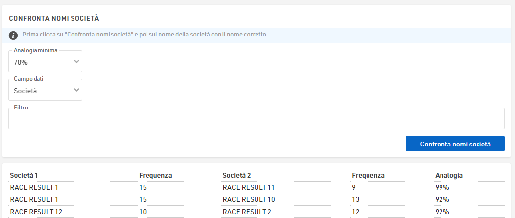 Puoi anche definire una somiglianza minima che due club devono mostrare nei risultati e puoi anche eseguire il confronto sulla base di un Campo di testo aggiuntivo invece del campo del club.