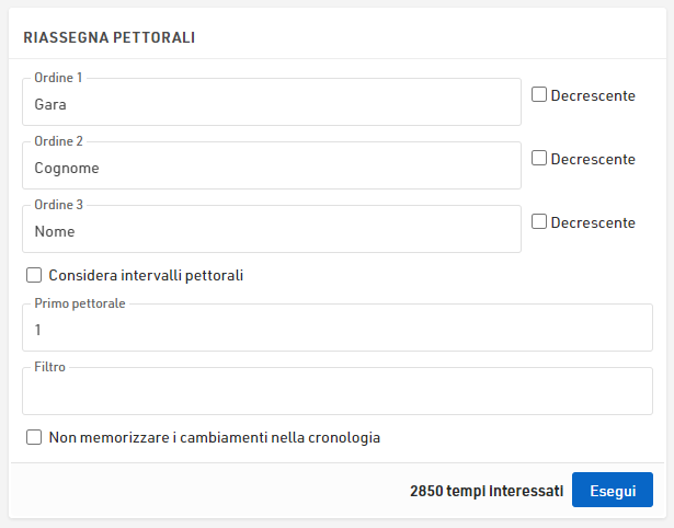 A tale scopo è possibile selezionare fino a tre campi che definiscono in quale ordine verranno assegnati i nuovi numeri di pettorale. Se attivi il box Considera intervalli di pettorali, verranno assegnati solo i numeri degli intervalli di pettorali della gara scelta.