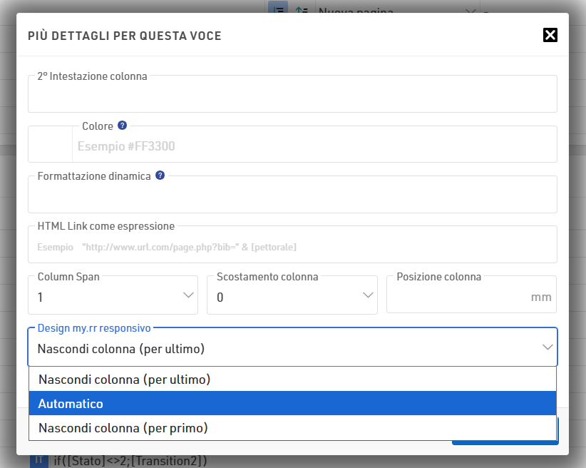 Nelle opzioni avanzate per ciascun campo nell'output, è ora possibile selezionare tra tre impostazioni: Nascondi colonna (per ultimo), Automatica o Nascondi colonna (per primo).