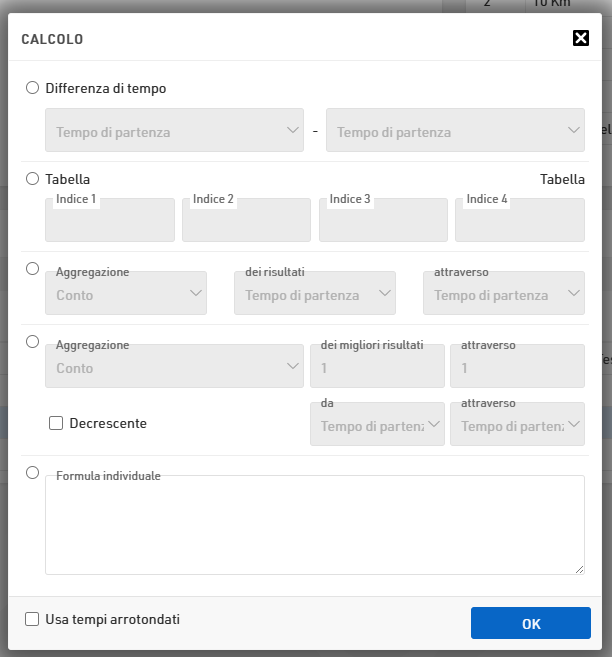 Se non selezioni un punto di cronometraggio all'interno della sezione Finestra Principale -> Risultati (Avanzati), la formula può essere inserita nella colonna Calcolo. Qui può essere usata ogni Espressione che restituisce un numero. Nota che se l'espressione non restituisce un risultato (NULL) o restituisce una stringa, il risultato non sarà riempito e questo è diverso da un tempo di 0:00:00.