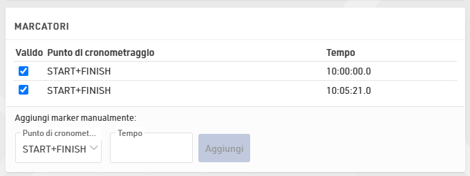 I marcatori possono essere creati anche manualmente usando la finestra di input presente in basso, andando a selezionare il punto di cronometraggio ed inserendo il tempo.