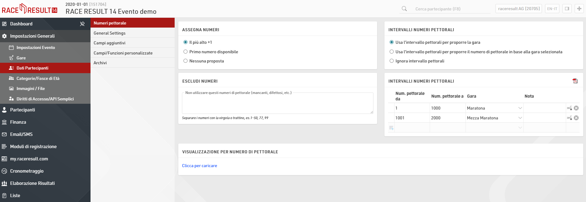 La sezione seguente ti consente di definire uno o più intervalli di pettorali per ogni gara; nell'esempio sono stati assegnati alla Maratona e alla Mezza Maratona i seguenti due intervalli di pettorali: 1-1000 e 1001-2000.