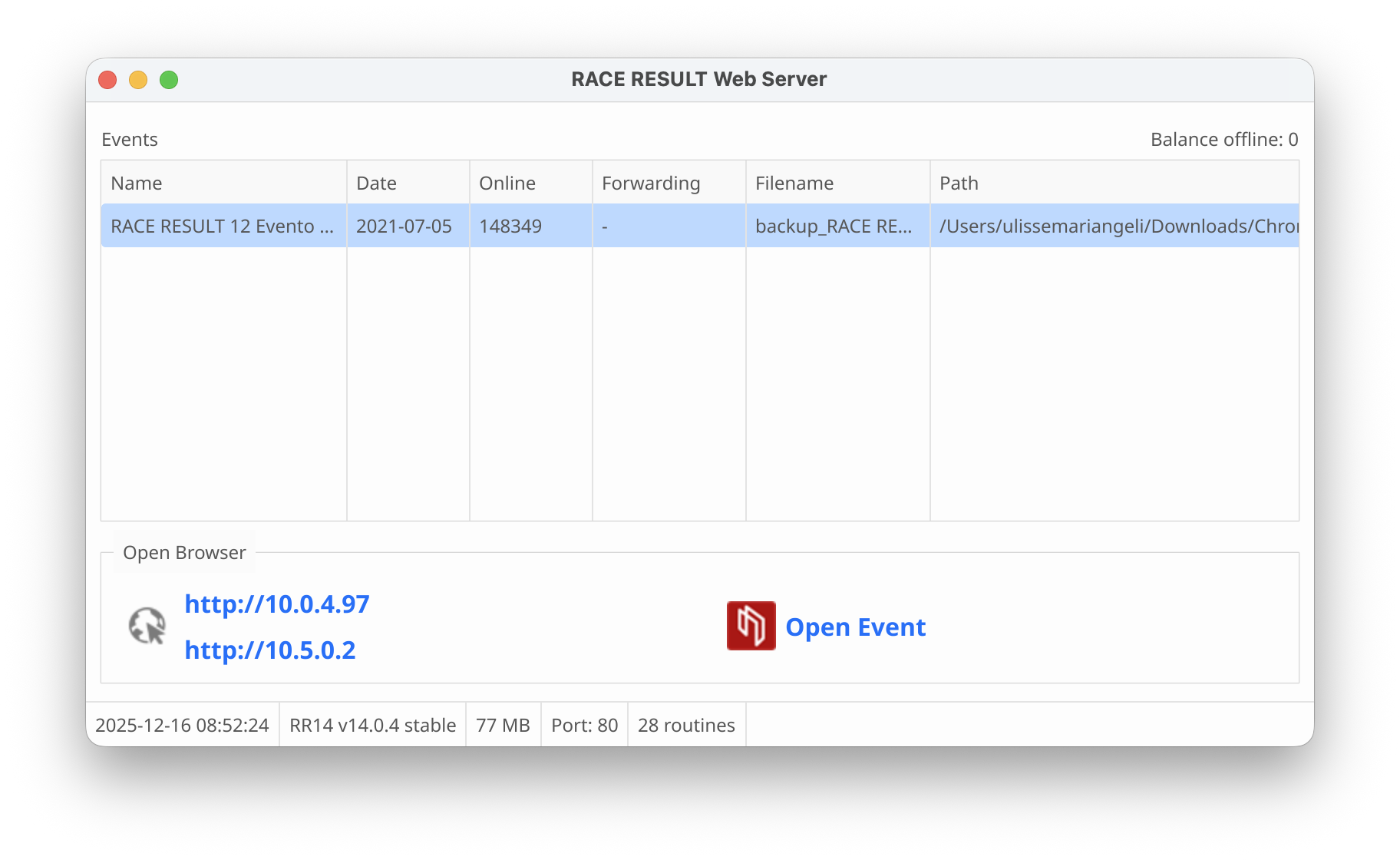 Quando si lavora offline, è necessario prima scaricare e installare il software RACE RESULT, quindi avviare il server Web RACE RESULT ed estrarre il file dell'evento.