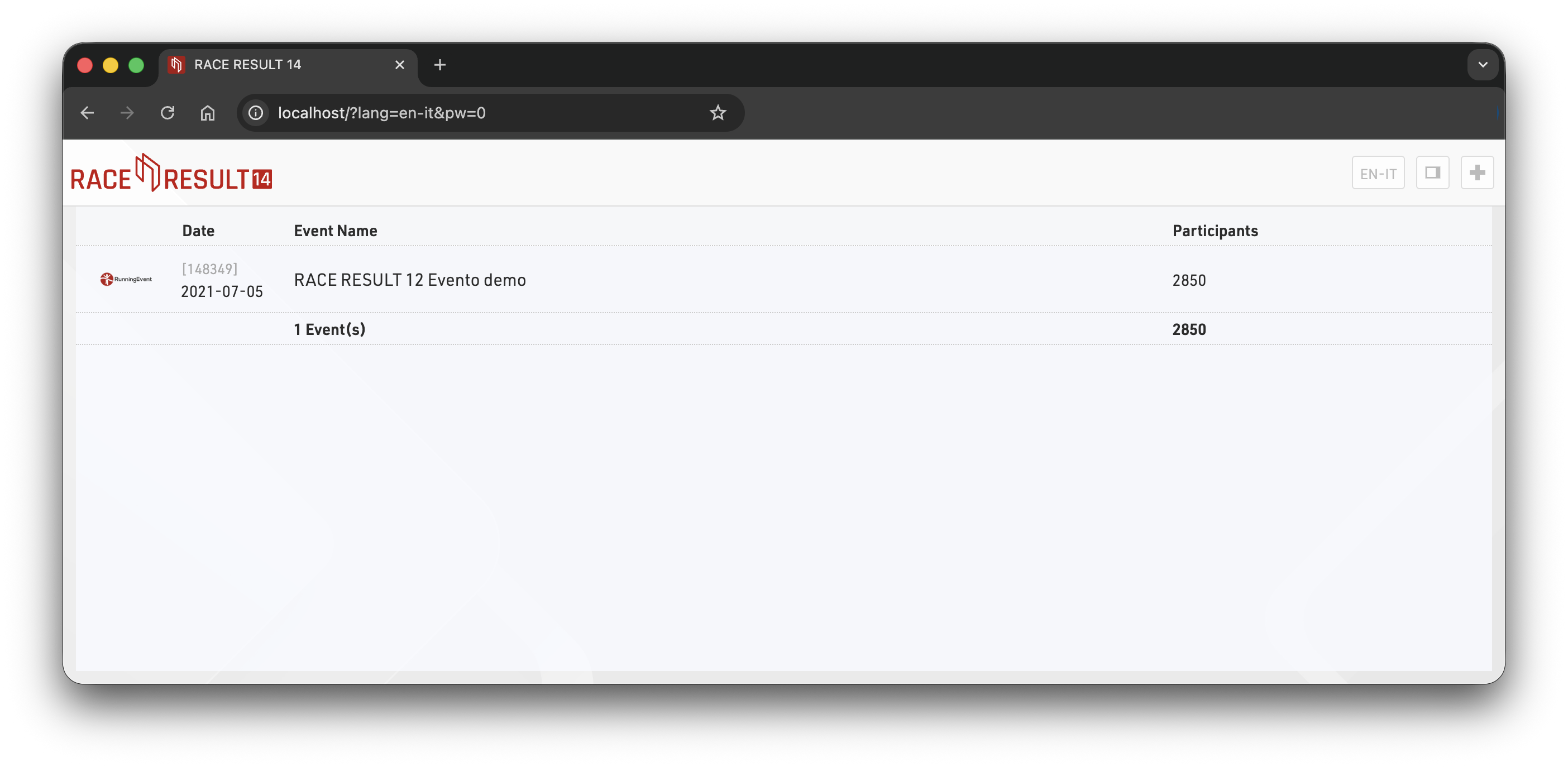 A questo punto avvia RACE RESULT Web Server andando sul menu Start di Windows o nel menu Applicazioni in MacOS. Questo, come detto, agirà da server web locale quindi mostrerà sul tuo browser web il sito RACE RESULT 14 (cosa che viene solitamente eseguita dai server nel data center RACE RESULT).