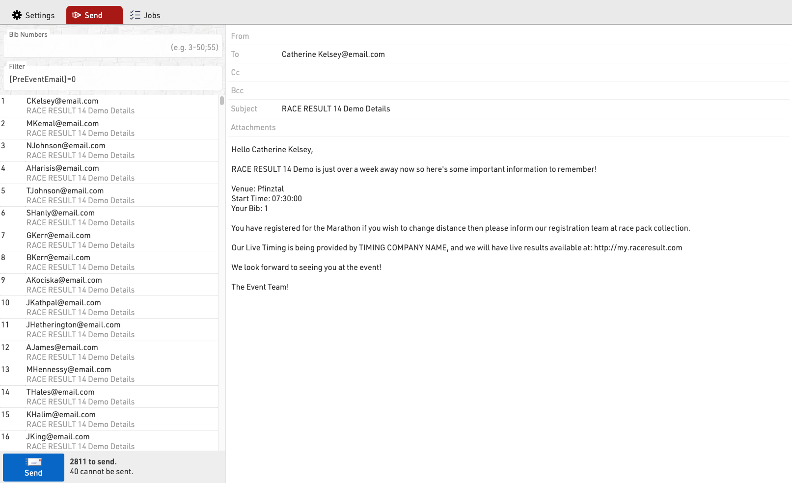 You can choose to send to specific bibs or adapt the filter before sending.